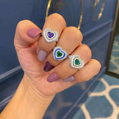A dazzling heart shaped modern rings inlaid with shiny colorful Swiss cubic zircon stones that mimic diamond designs in color, luster and accuracy. This pieces are characterized by modern design and bright luster. The ring is a perfect piece to add a touch of elegance to your everyday outfits and occasions. It is an ideal choice for gifts and personal use.